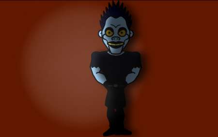 Pour ceux qui ne connaissent pas, il s'agit de Ryuk, un personnage clé du manga Death Note (que j'affectionne beaucoup). Dans l'histoire il incarne un dieux de la Mort, il est par ailleurs l'oncle de la Mort Junior. Il possede un cahier dont le simple fait d' y écrire le nom d'une personne suffit pour la tuer. A oui, autre fait : Il adore les pommes.
