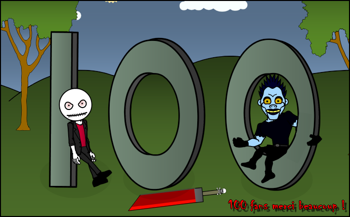 Vous êtes plus de 100 fans à aimer la page facebook des aventures de la Mort Junior ! Vous savez pas à quel point ça me fait plaisir, merci beaucoup. Tout cela me donne encore plus l'envie d'avancer dans le second tome ! Je vous dis à bientôt et je vous souhaite de bonnes vacances pour ceux qui en ont, et Merci encore !!!